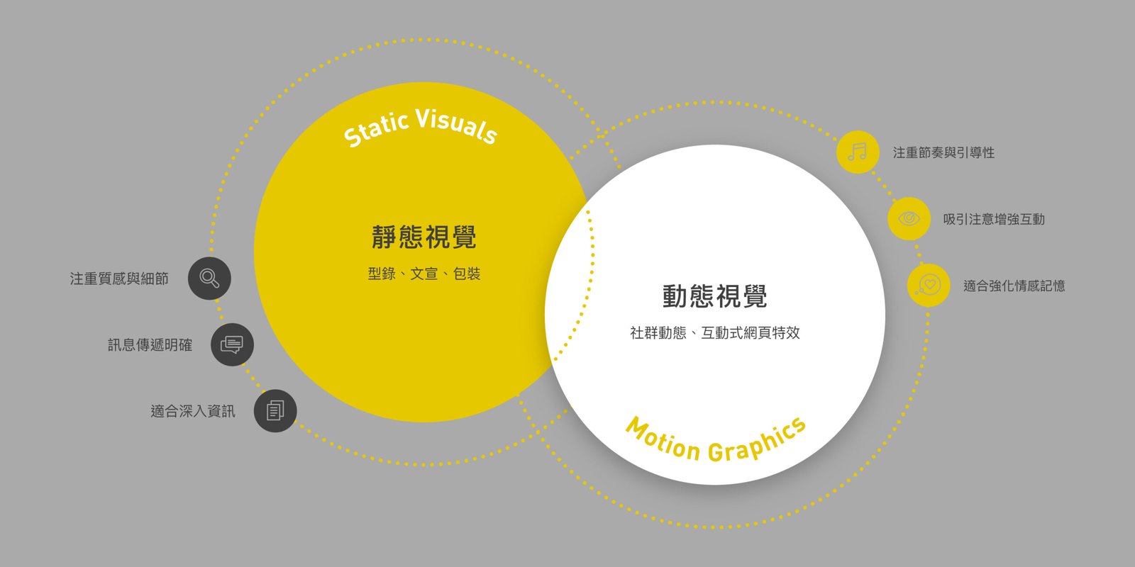 在當代品牌溝通中,視覺已經不再只是靜態圖像,而是涵蓋印刷物、廣告圖組、數位互動到動態影片的完整體系。要建立一致的視覺語言,必須同時掌握靜態與動態的策略差異。靜態設計需在有限版面中傳遞最大效益:清楚的資訊層次,一致的色彩與字型規則,以及兼顧專業與質感的耐看細節。動態設計則在於營造體驗:以節奏導引訊息流動,透過情感元素強化沉浸感,並讓品牌符號在識別上於移動中依然清晰。