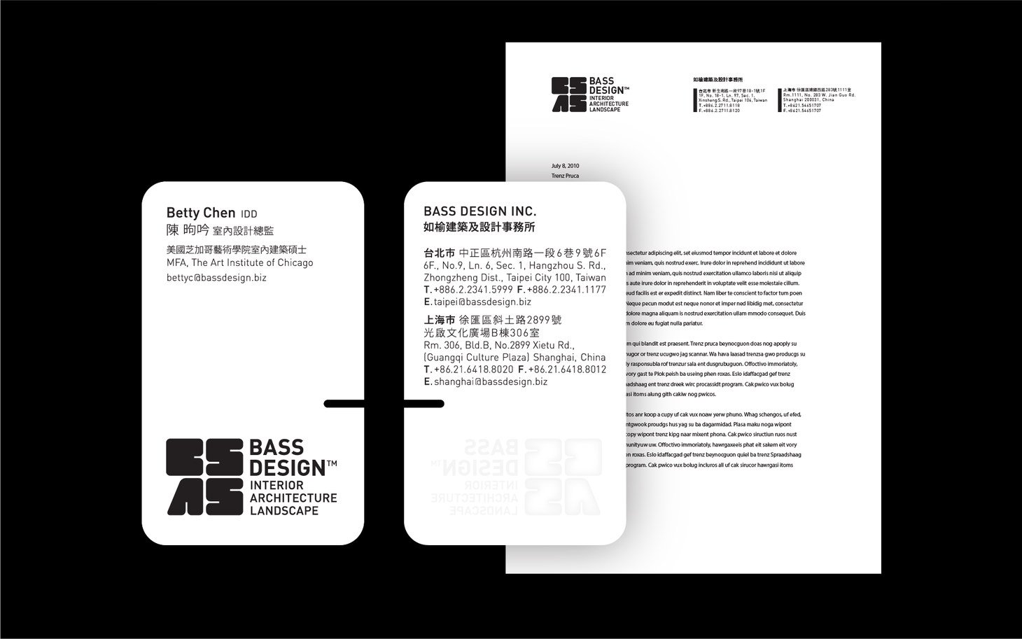 識別系統延伸至名片、信封、信紙等企業用品,採用穩定簡潔的排版與理性線條語彙,使品牌在各個接觸點都能展現一致的專業調性。視覺上保留留白與層次,使 Bass Design 的跨領域協作特質更清晰可辨。