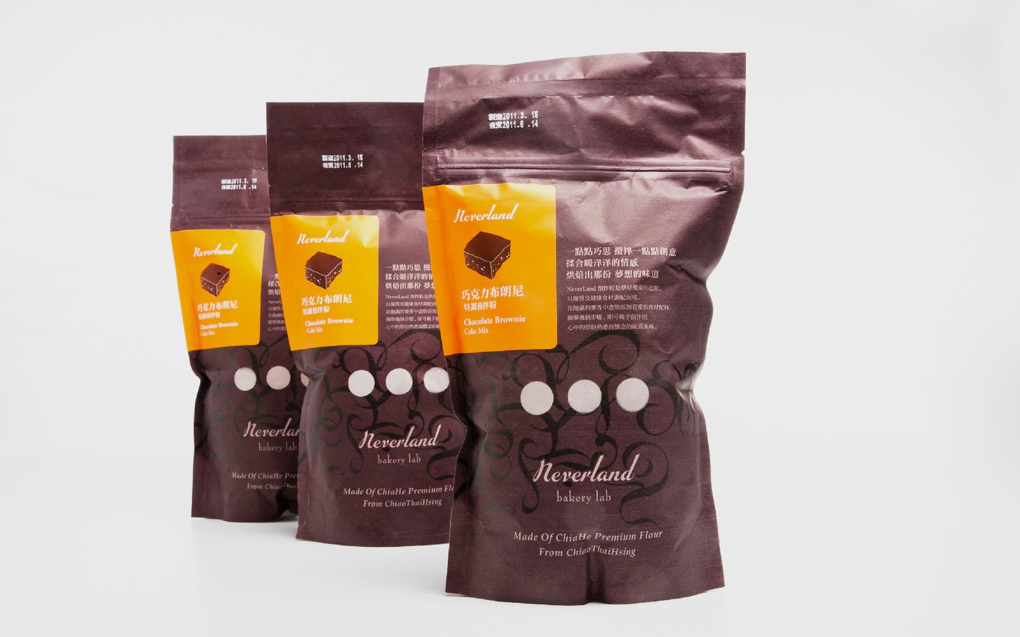 品牌系統不僅服務麵粉主產品,也延伸至其子品牌 Neverland 的預拌粉系列。以相同的識別邏輯、材料語彙與色彩節奏,使子品牌能在市場中更具一致性並形成清楚的家族感。