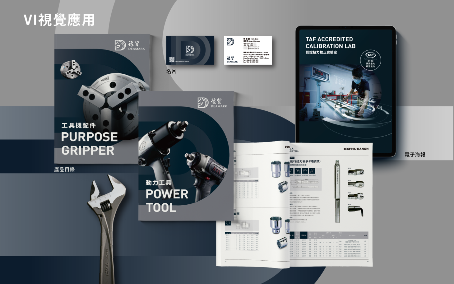 識別系統將工具專業的理性質地與品牌精神轉化為穩定、強而有序的視覺結構。從標誌、色彩、海報、名片到產品型錄,皆以一致而清晰的語彙呈現代理商的專業輪廓,使品牌在市場中更具辨識度,也更能對應跨世代的溝通需求。