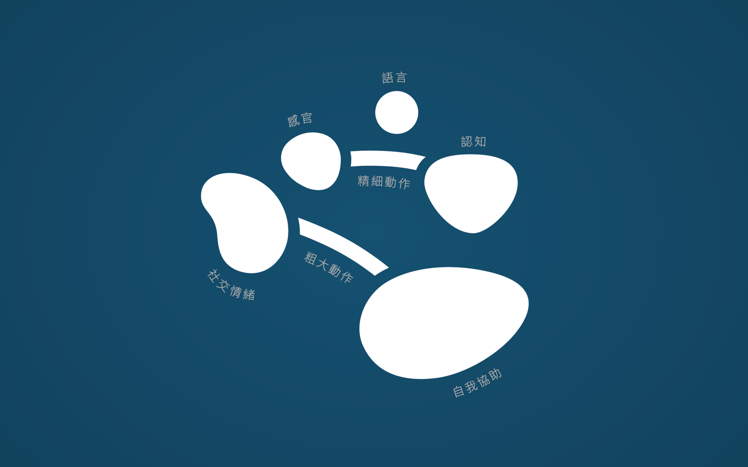 識別系統運用卵石形狀、柔和線條與亮度平衡的色彩組成視覺骨架,象徵七大發展面向彼此連動的關係。串聯的線條代表跨領域整合的療育方式,也讓品牌在專業與親和之間維持穩定、易辨識的整體語彙。