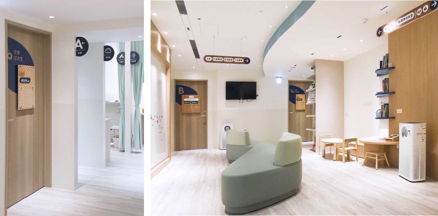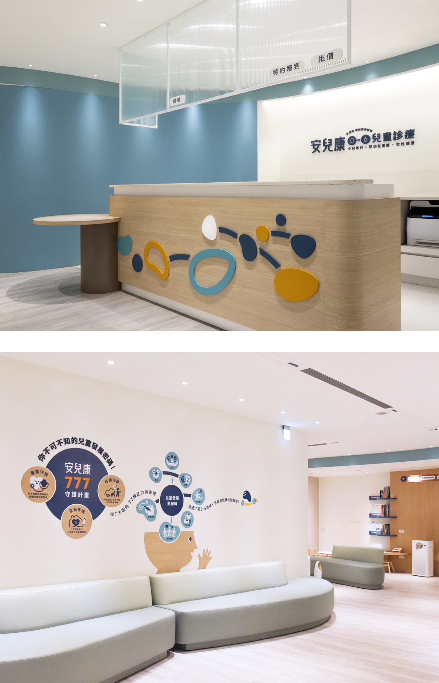 空間視覺運用活潑但不浮躁的色塊、幾何符號與簡潔線條,讓診所氛圍遠離冷調醫療感,轉而呈現一個能安全探索、自然放鬆的兒童場域。顏色與符號並非裝飾,而是品牌理念的延伸,使視覺與功能在空間中緊密連接。
