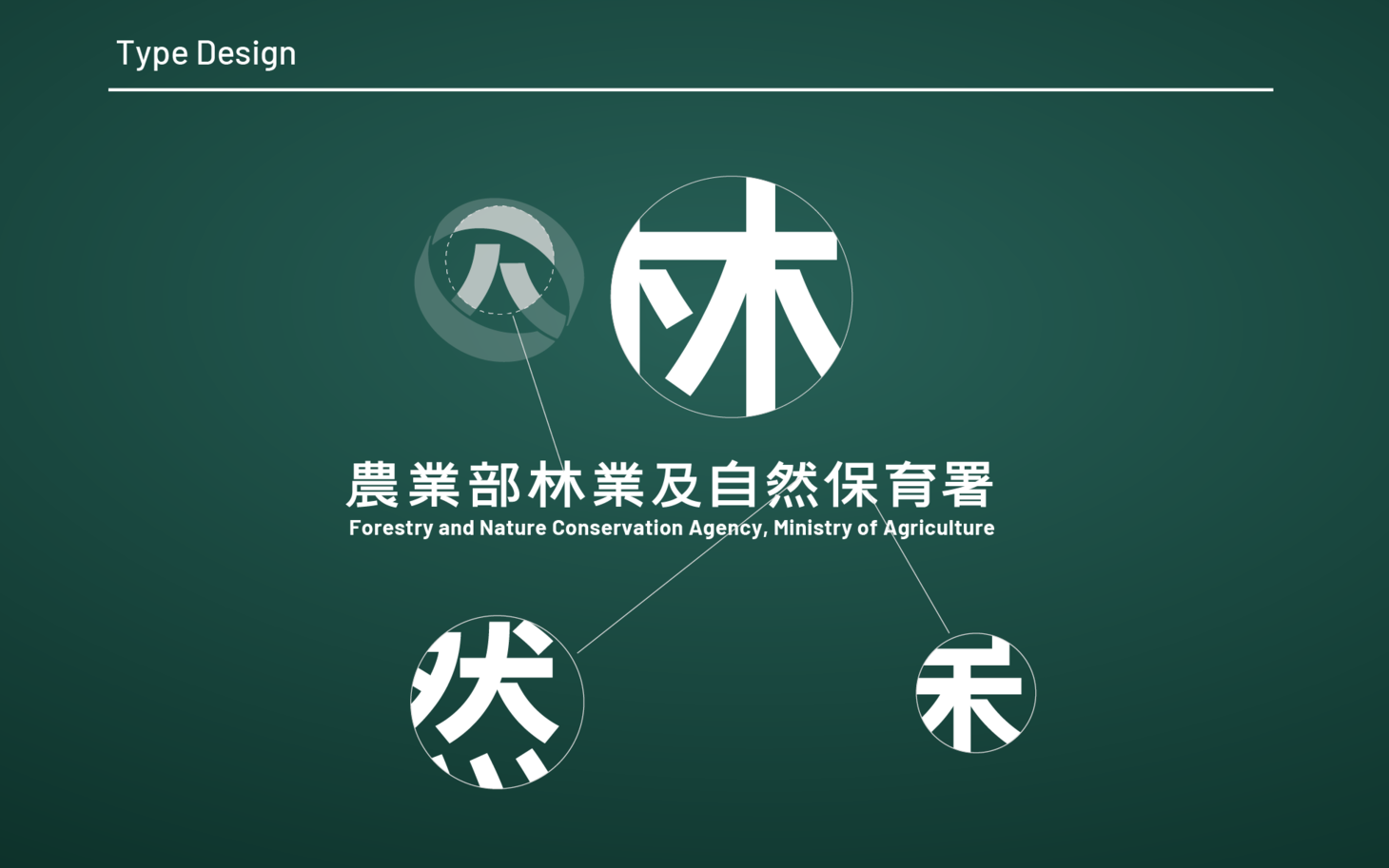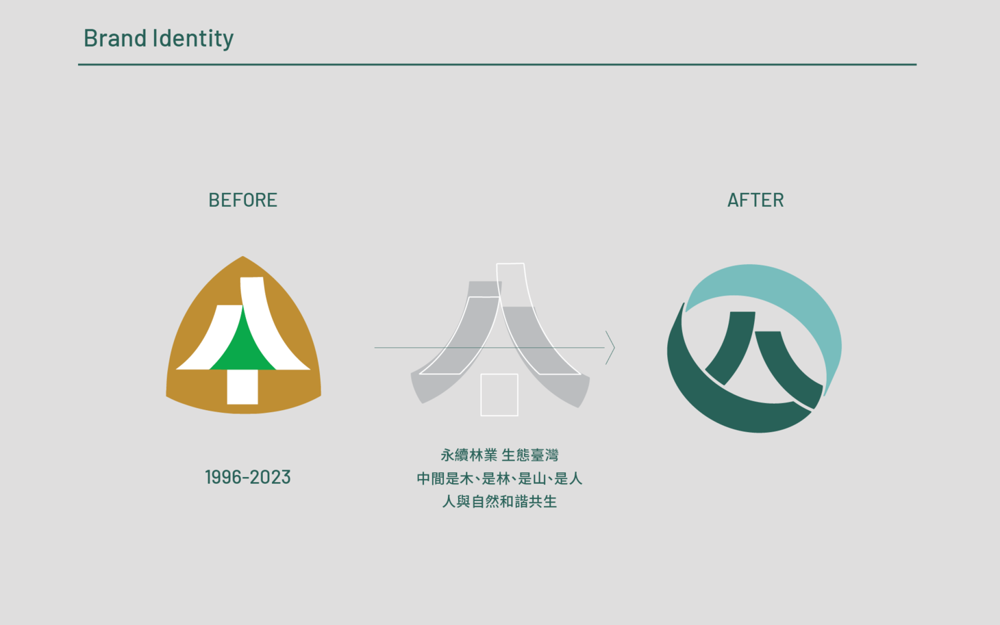 新識別中的中心符號同時是一個人,也是樹木與山形的延伸。此符號承繼原林務局印象,並轉化為更具時代感的語彙,象徵森林治理、自然保育與全民共享的整合願景。