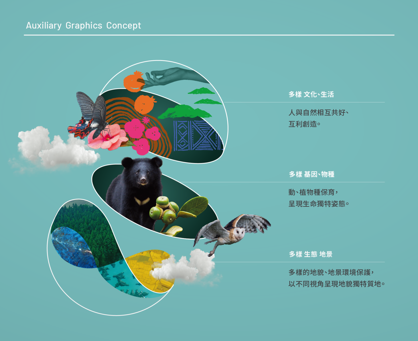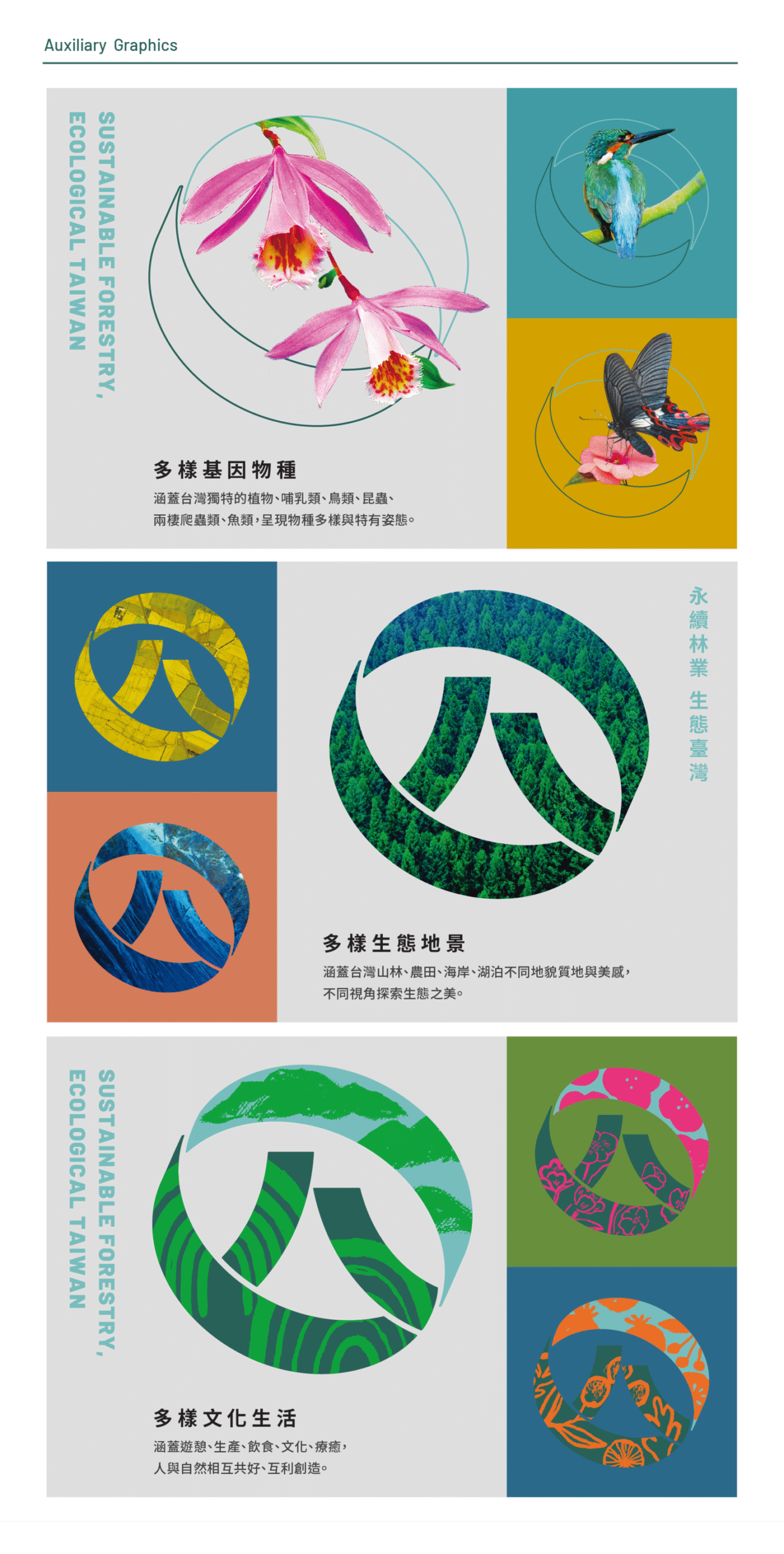 品牌輔助圖紋透過影像、筆觸與肌理交織,象徵基因、物種、生態、地景、文化與生活等多層次生命樣貌。視覺系統呈現環環相扣的生物多樣性,讓永續不只是理念,更成為可被感受的意象。