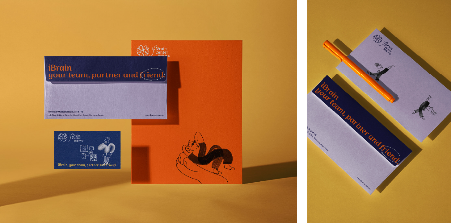 識別主色以沉穩的藍色呈現科學、信任與醫療專業;輔色橘色則帶來活力與陪伴感,象徵進步、希望與行動力。兩者交會形成溫和而不疏離的視覺節奏,使愛腦中心在醫療品牌中呈現清晰調性。