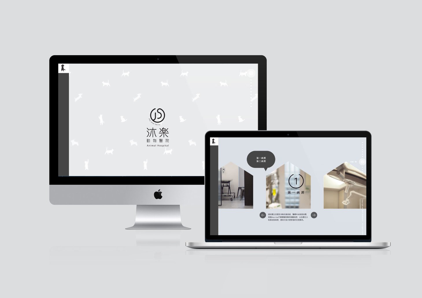 沐樂由 Joy 與 Smile 兩位獸醫師創立,品牌標誌結合 J、S 與招手般的尾巴,象徵醫院以動物為本的理念。識別設計既親切又具專業感,傳遞醫院希望成為寵物與飼主之間「溫柔橋梁」的初衷。