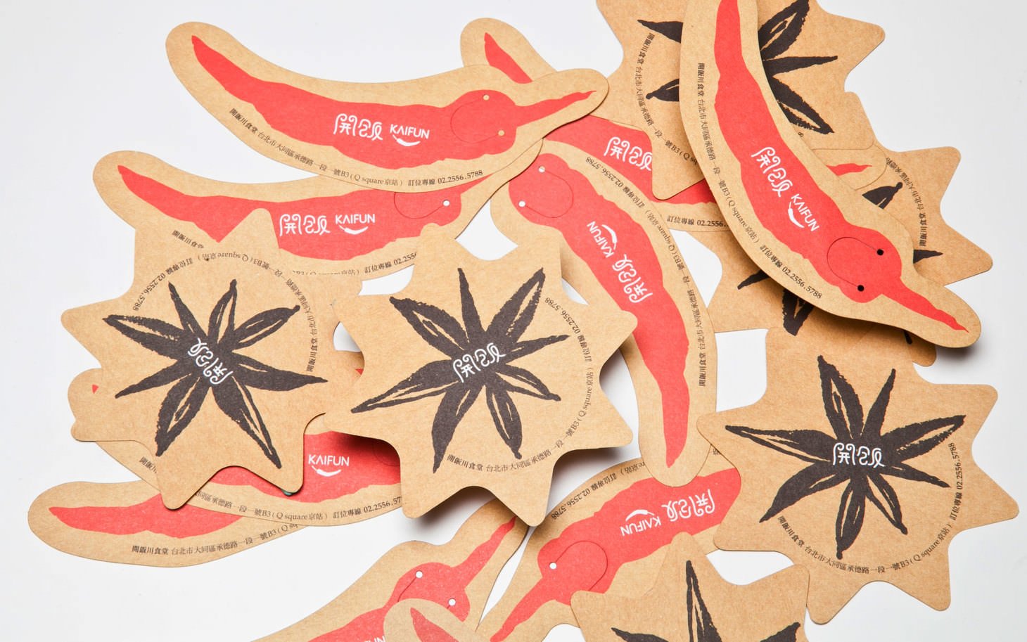 設計以川菜文化中最具代表性的花椒、辣椒、香料等元素,組成人臉造型,呈現吃辣時微燙、微麻、微陶醉的表情。這個主視覺讓品牌一眼就能被記住,也自然延伸成各式應用品的視覺語彙。