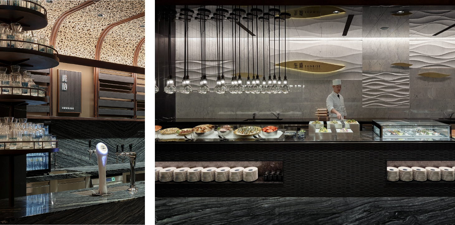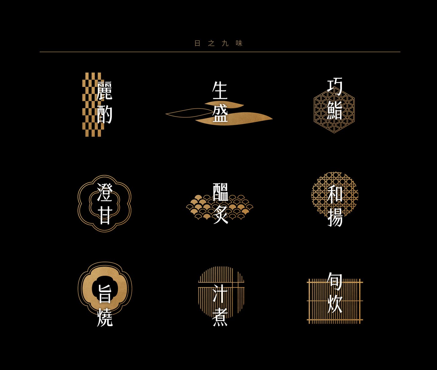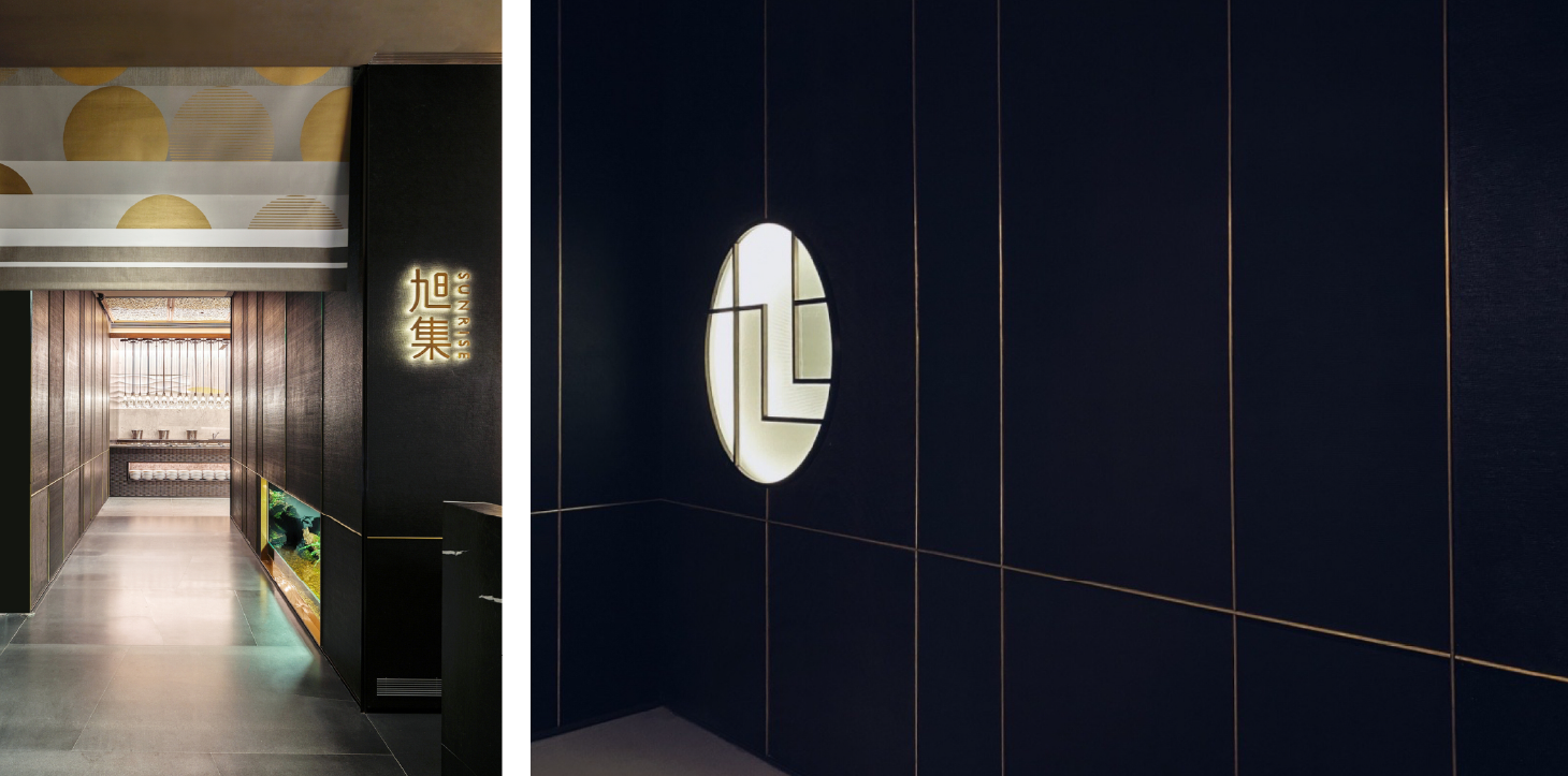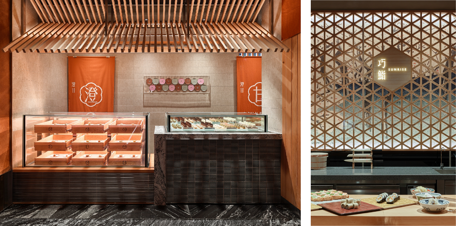 依據日本料理的烹調法與風味,我們將空間劃分為九大主題區域,包括:麗酌(Sake Bar)、生盛(生魚片)、巧鮨(懷石小點與握壽司)、澄甘(甜點)、醞炙(燒烤)、和揚(炸物)、旨燒(鐵板)、汁煮(鍋物)、旬炊(蒸物)。每一區皆以專屬的視覺語彙與命名傳遞烹調特色,使整體動線像是一趟日本料理的遊逛旅程。