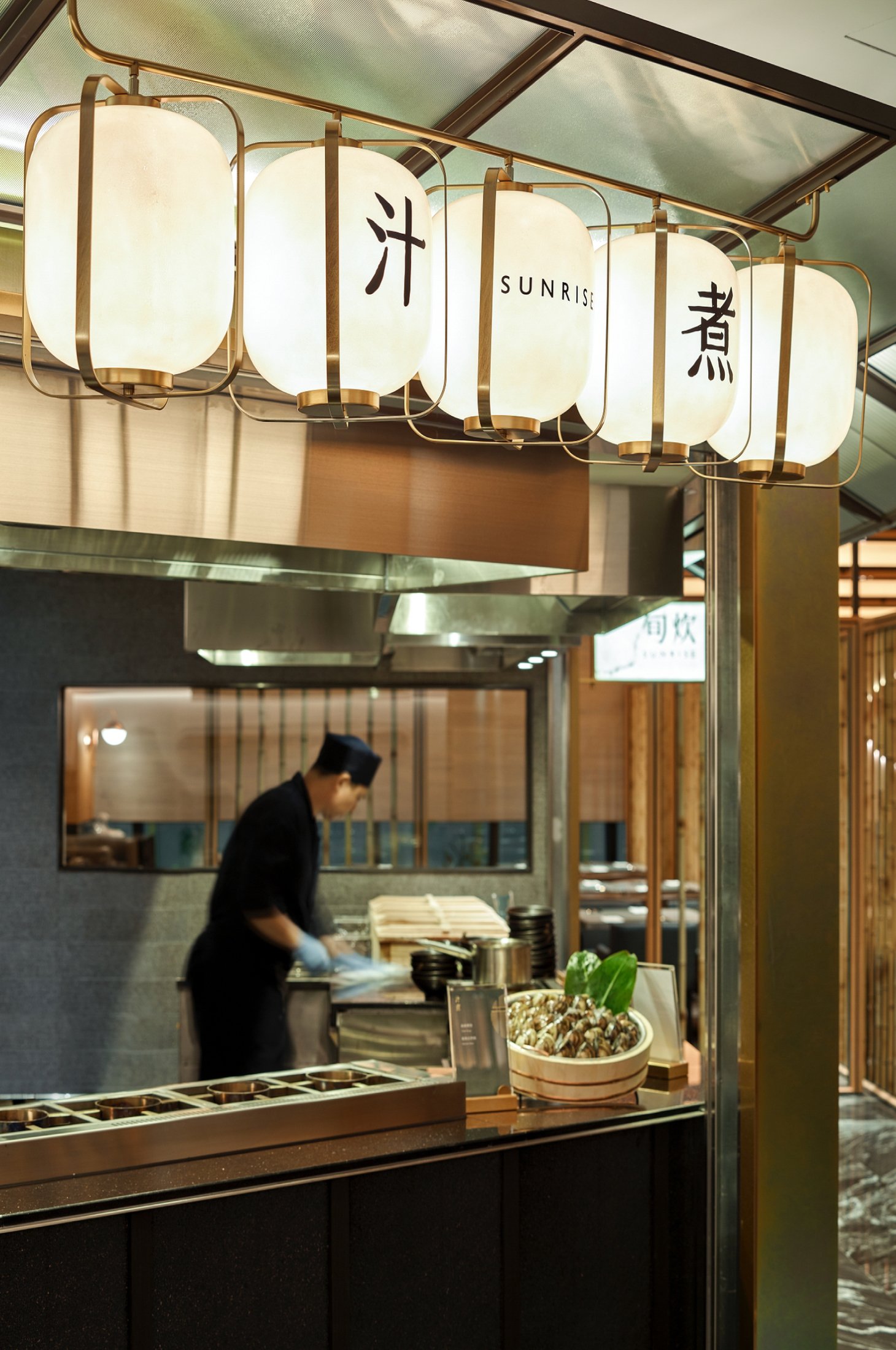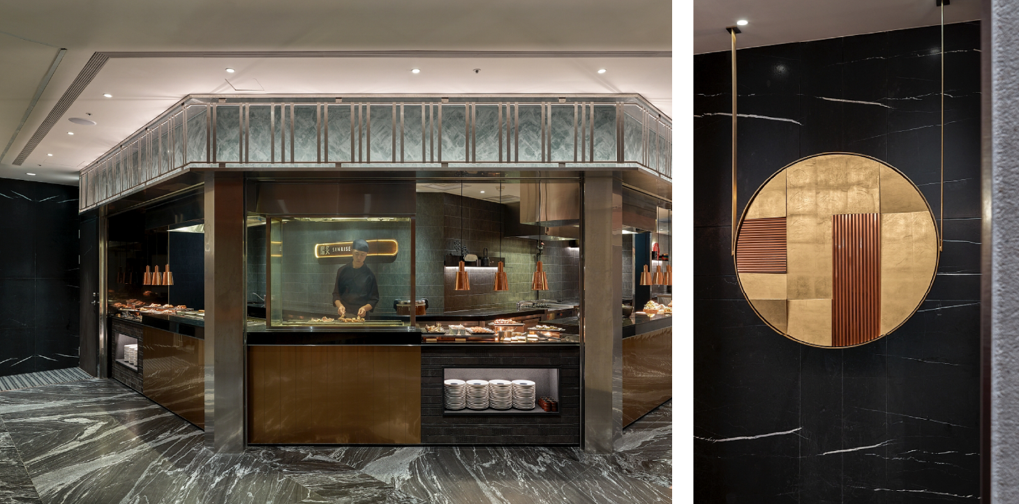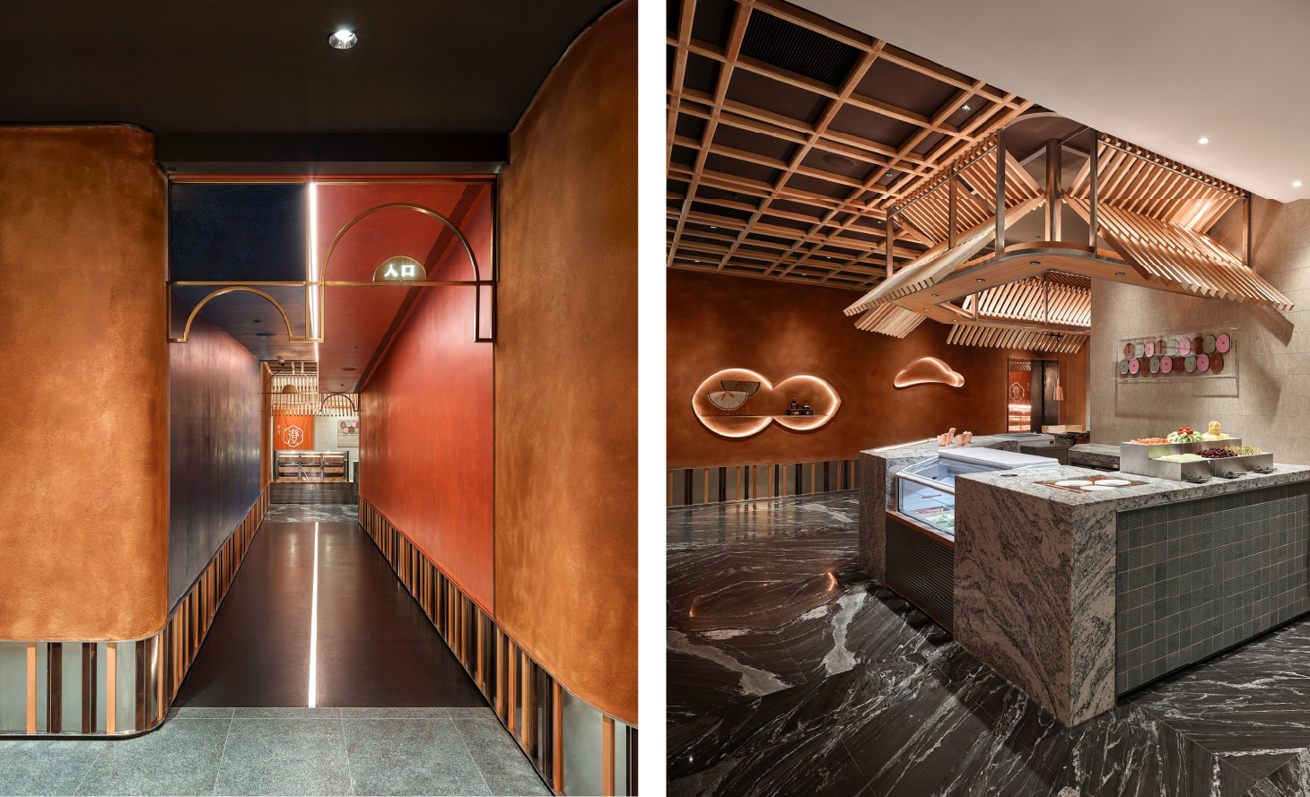依據日本料理的烹調法與風味,我們將空間劃分為九大主題區域,包括:麗酌(Sake Bar)、生盛(生魚片)、巧鮨(懷石小點與握壽司)、澄甘(甜點)、醞炙(燒烤)、和揚(炸物)、旨燒(鐵板)、汁煮(鍋物)、旬炊(蒸物)。每一區皆以專屬的視覺語彙與命名傳遞烹調特色,使整體動線像是一趟日本料理的遊逛旅程。