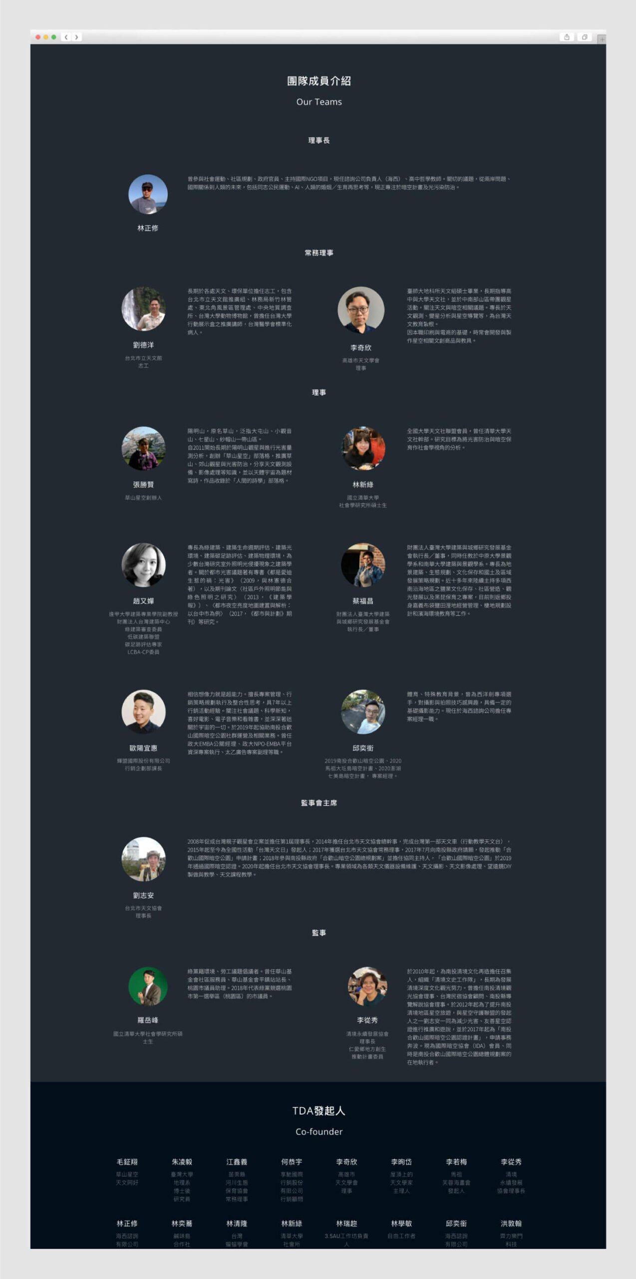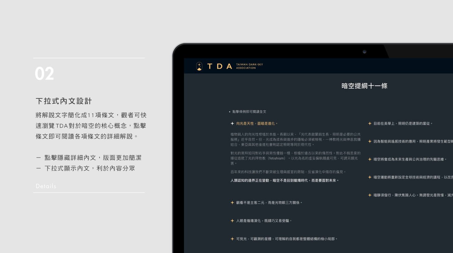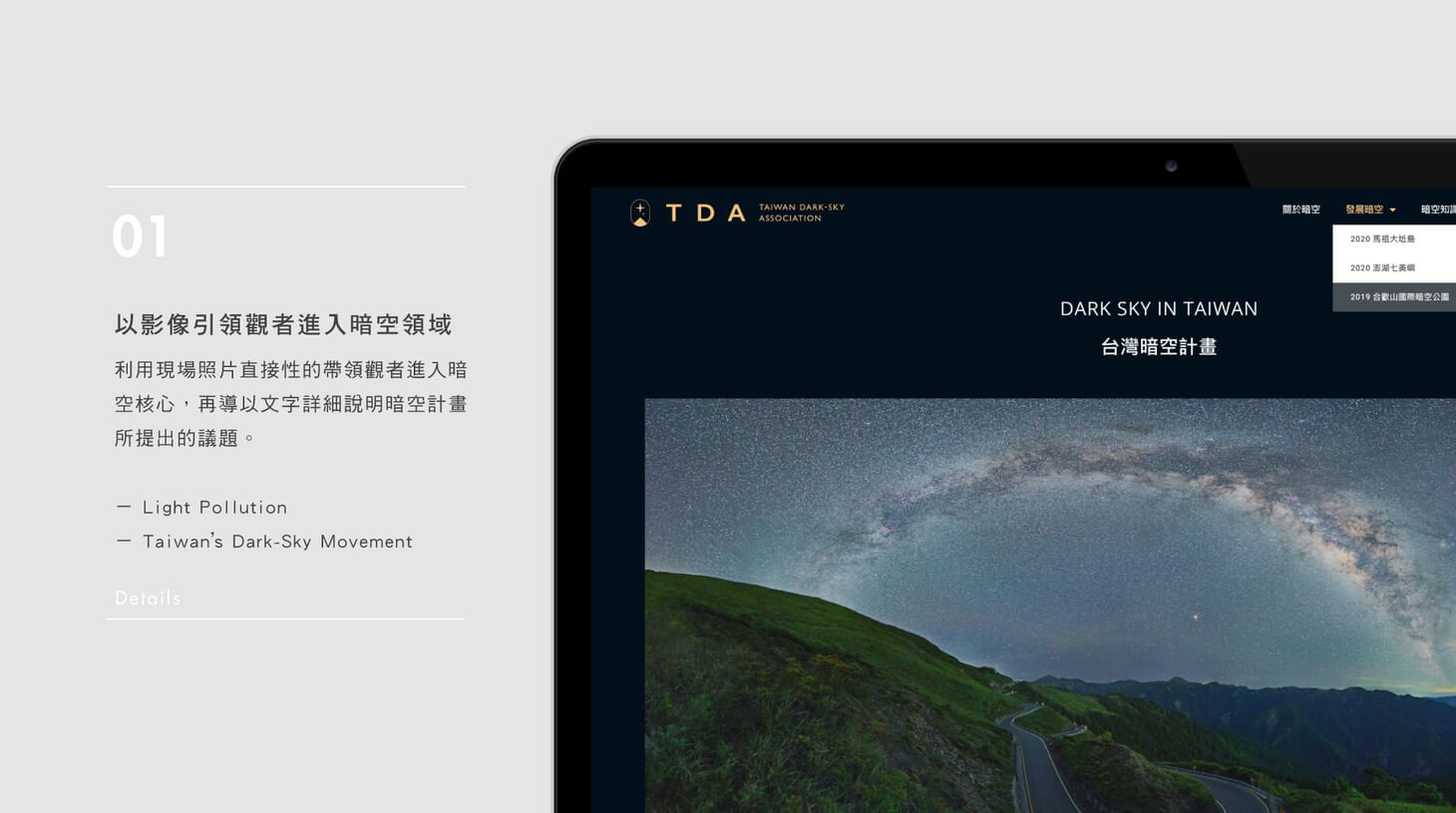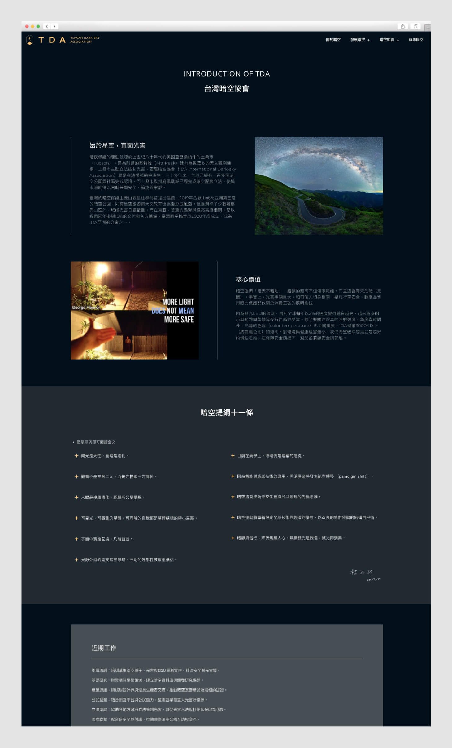 臺灣暗空協會(TDA)主張減光、節能與安全並行,致力推廣友善光環境與觀星教育。網站以此為基礎重構資訊架構,使大眾能快速理解什麼是光害、如何改善、以及如何參與暗空行動。