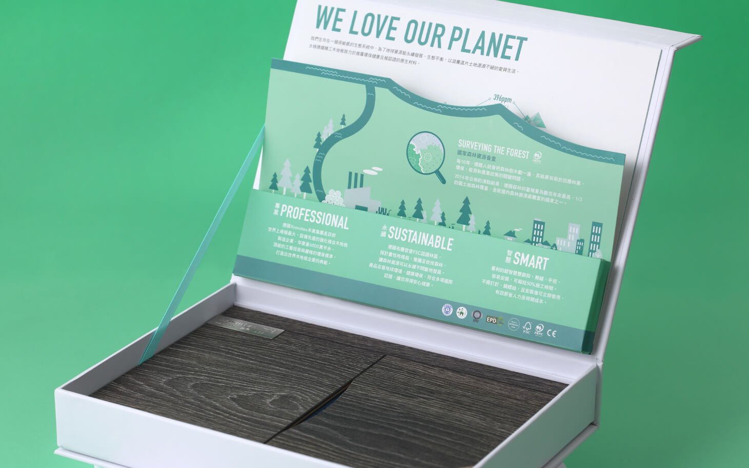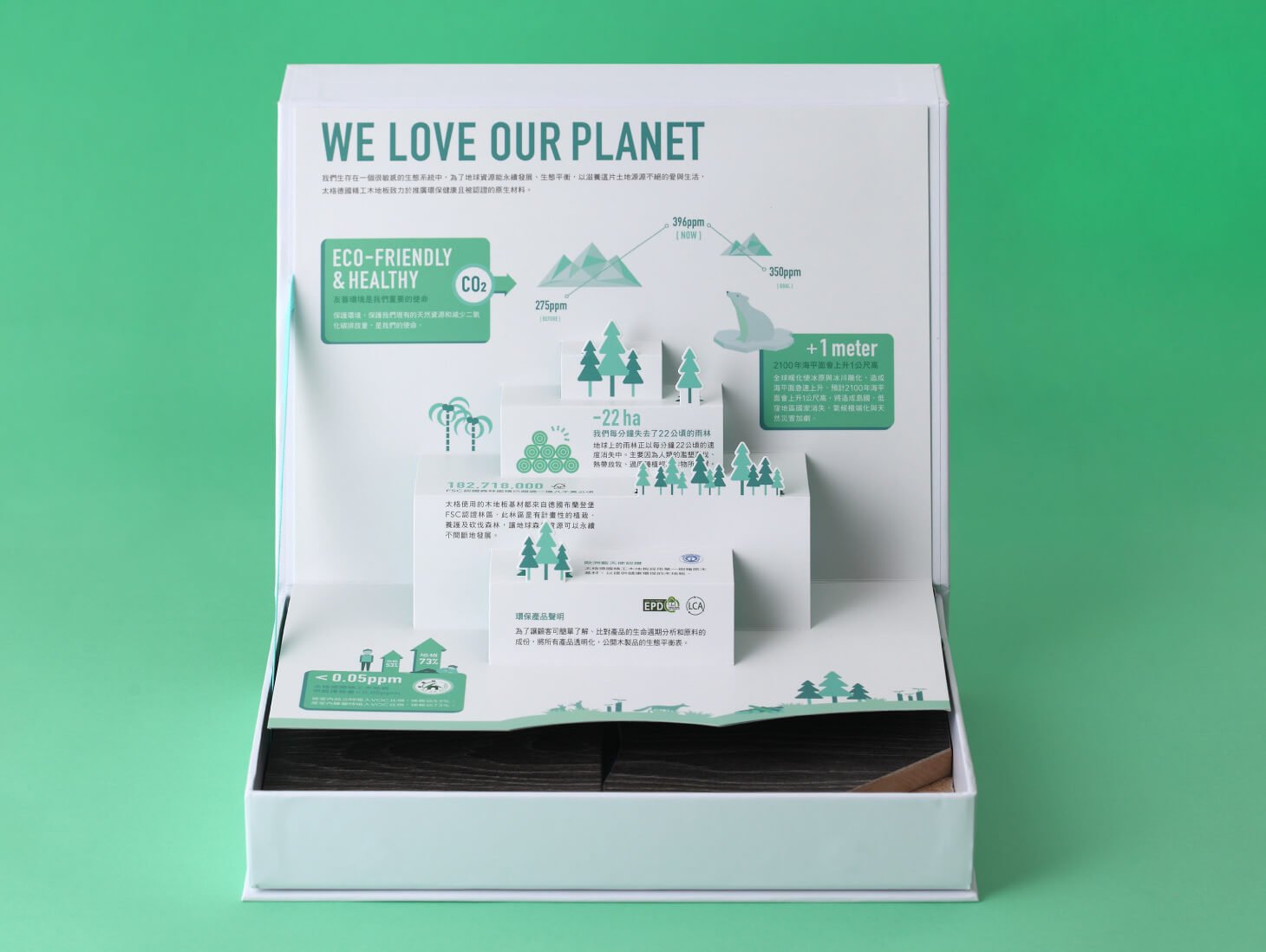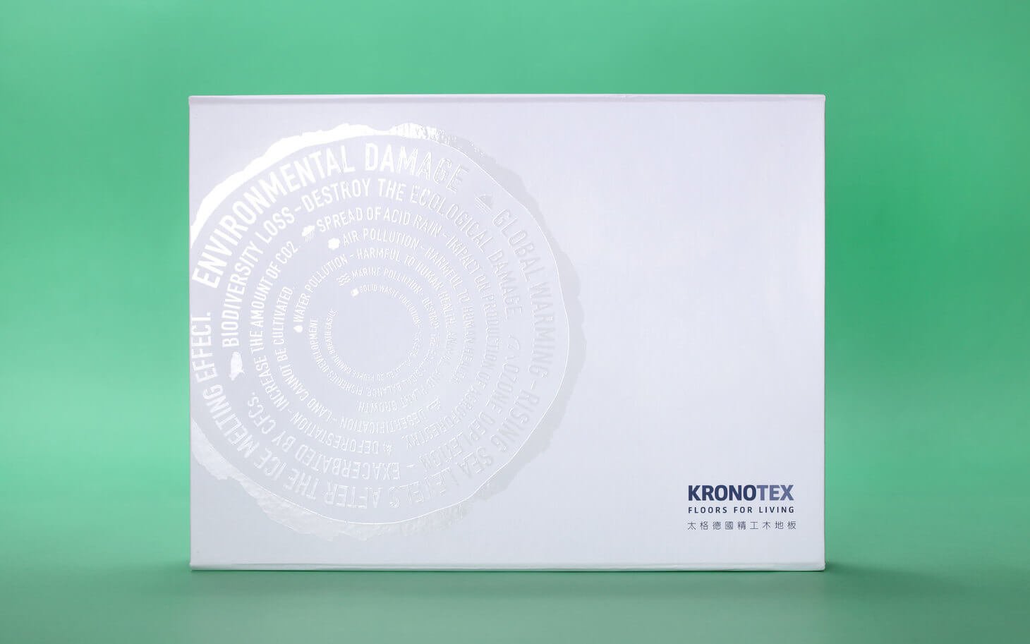太格地材代理的德國 Kronotex 精工木地板,以遠高於歐盟標準的環保規範著稱。我們以板材盒作為溝通介面,將產品的環境價值具象化,讓「選材友善地球」成為看得見、感受得到的品牌訊息。
