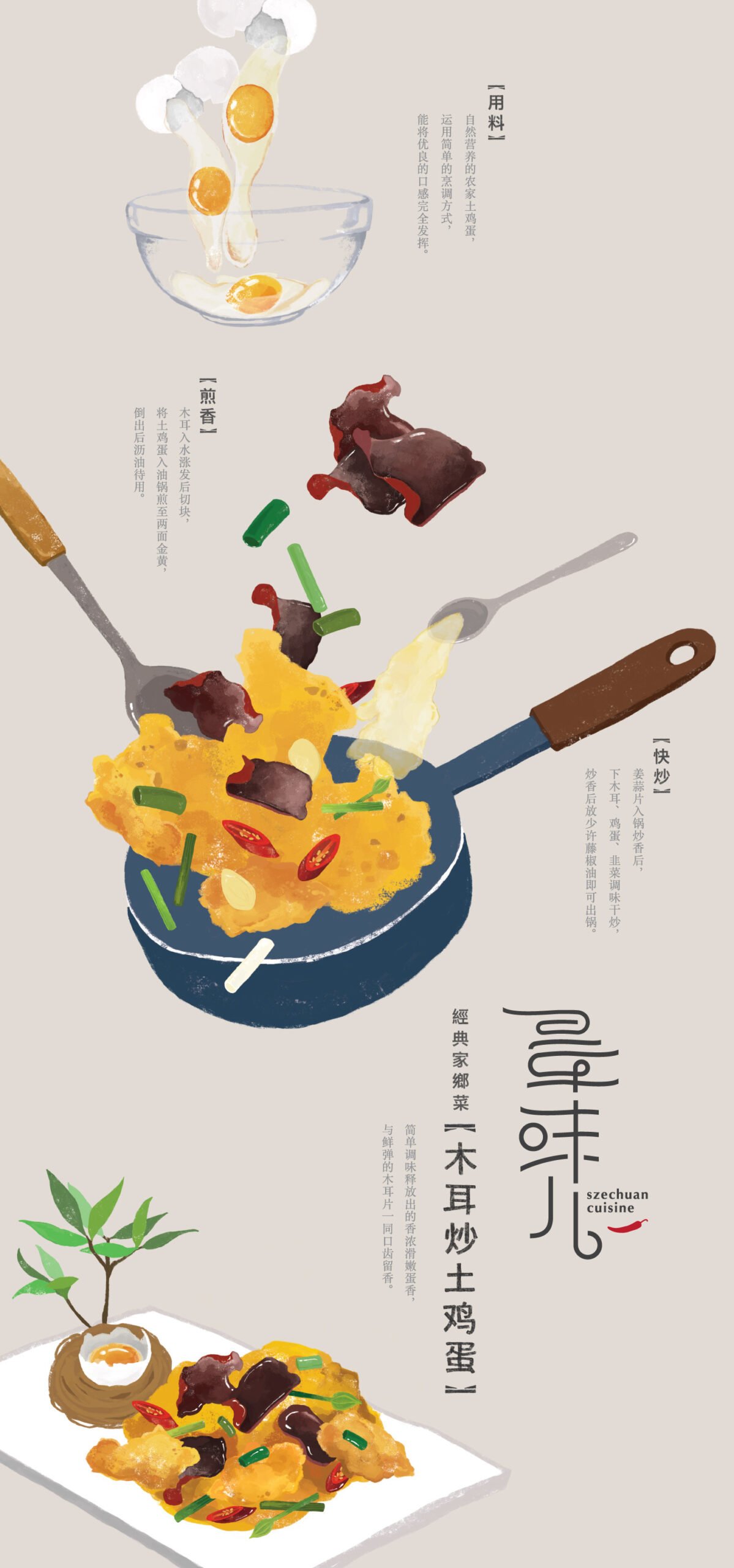 視覺設計以插畫式食譜為主軸,描繪川菜做法、食材與香氣層次,讓味道在視覺上也能「看得到」。這種圖像筆調,使川菜的日常感、親切感與食趣更具溫度。